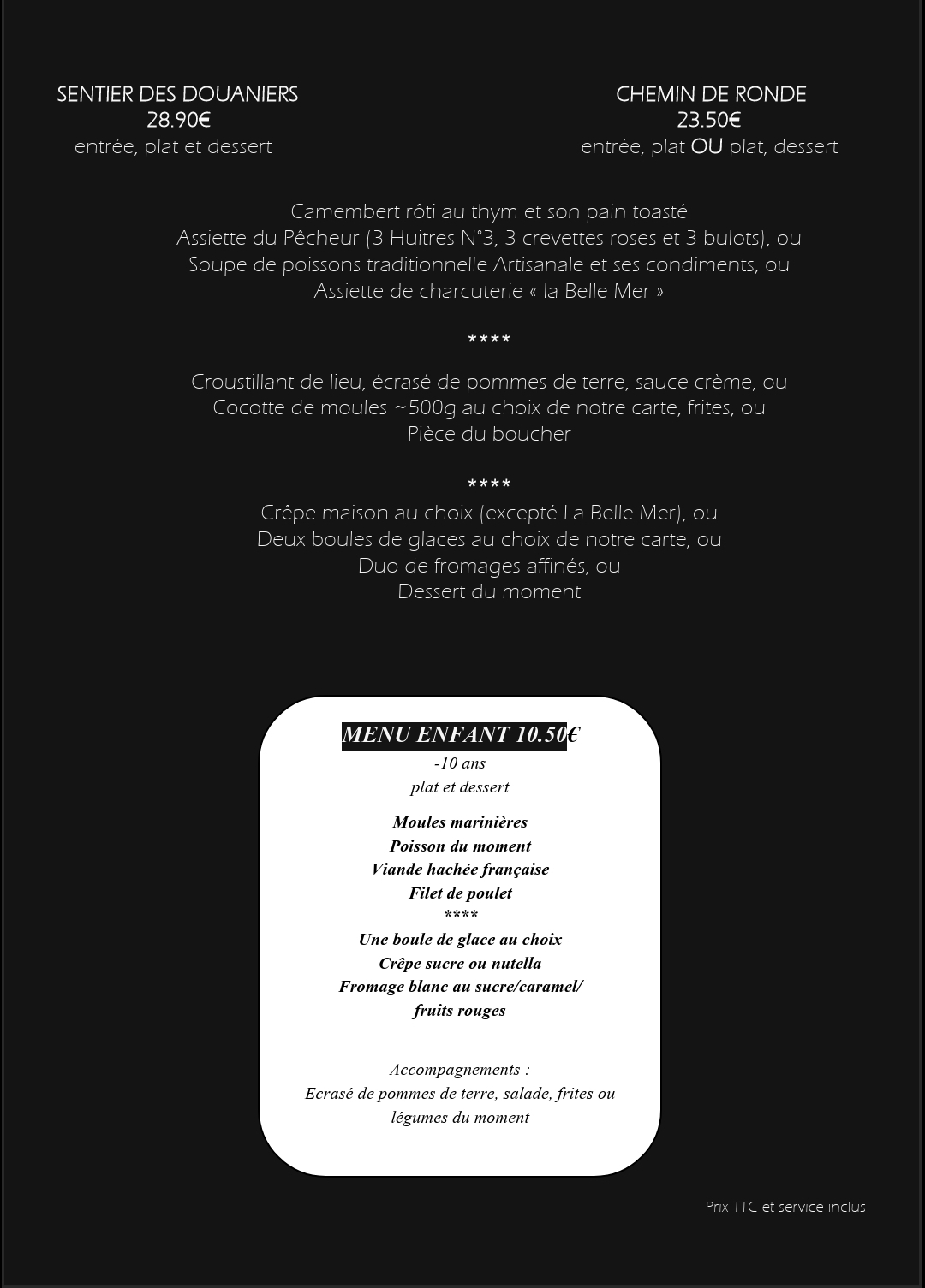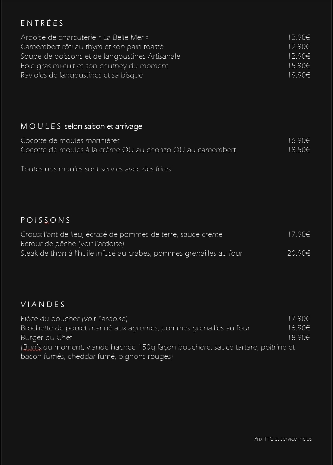 Foie gras de canard, Soupe de poissons, les huitres ou plateau de fruits de mer, Burger du Chef, Filet de Bar sauvage, Tentacule de poulpe origine France, Poisson du moment et d'autres plats cuisinés avec passion et les desserts maison.