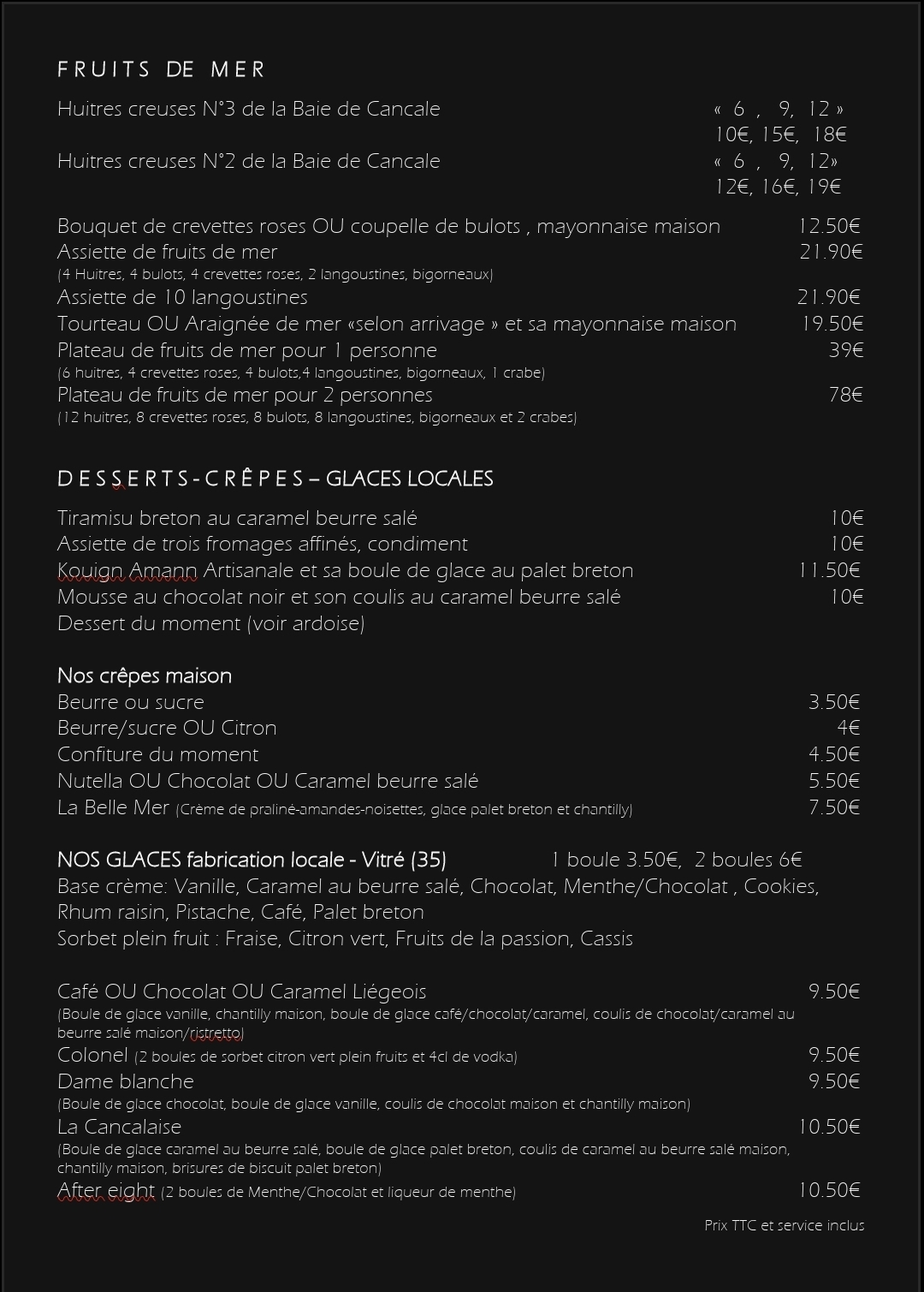 Un accueil chaleureux vous attend à La Belle Mer . Nous sommes ravis de vous recevoir à Cancale ! Laissez-vous tenter par nos délicieux mets.
